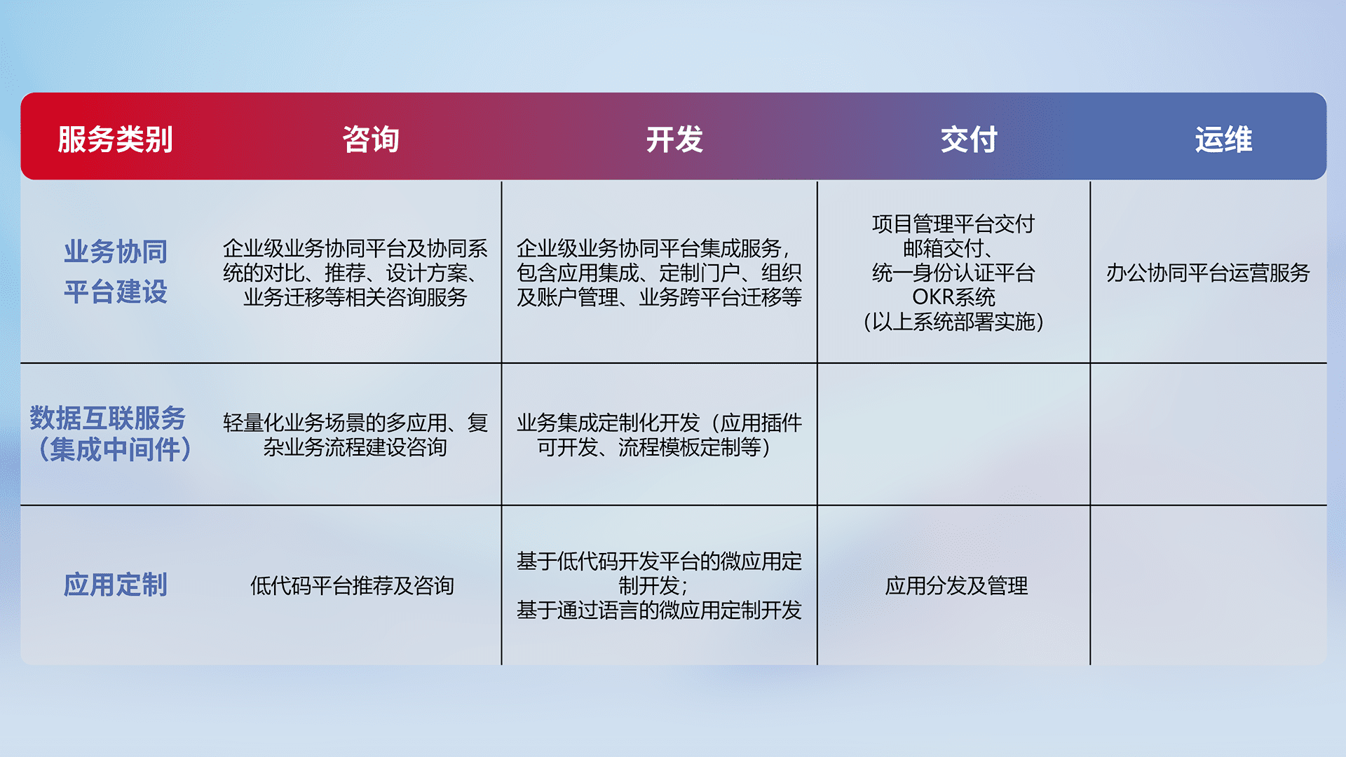 针对钉钉、、、、企微、、IDaas等平台级产品提供产品的规划、、、、方案、、、、交付、、定制化开发等服务,,,,实现如统一协同办公、、、智能客户服务、、、、混合会议管理、、、、智能数据查询、、等业务场景,,,,实现数字化转型。。。